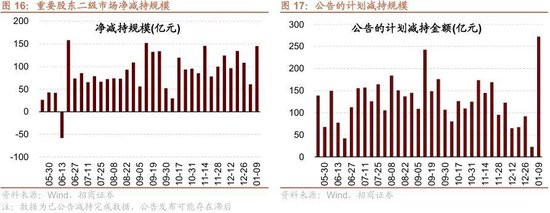 资金需求方面,上周(1/5-1/9)回升至12.4亿元,共有1家公司进行IPO发行,截至1月9日公告,未来一周将有1家公司进行IPO发行,计划募资规模16.1亿元。重要股东净减持规模扩大,净减持145.0亿元;公告的计划减持规模272.3亿元,较前期上升。