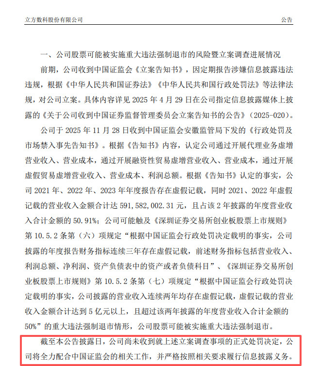 截至公告披露日,立方数科披露了该事项的最新进展,尚未收到就上述立案调查事项的正式处罚决定,公司将全力配合中国证监会的相关工作,并严格按照相关要求履行信息披露义务。
