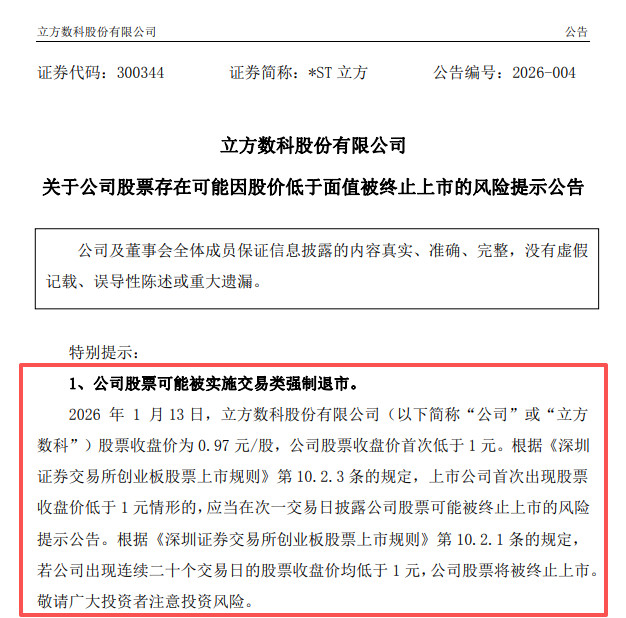 根据公告,2026年1月13日,立方数科股票收盘价为0.97元/股,公司股票收盘价首次低于1元。根据《深圳证券交易所创业板股票上市规则》第10.2.1条的规定,若公司出现连续二十个交易日的股票收盘价均低于1元,公司股票将被终止上市。