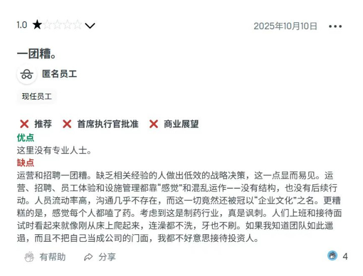 据公司现任及前任员工爆料,Retro的结构性问题不断:所谓的顶尖实验室是由多个集装箱拼接而成;仪器老旧失灵、实验控温空调故障频繁;甚至爆发过虫害与鼠患,研发环境令人堪忧。在职场评价网站Glassdoor上,员工吐槽集中在"管理混乱"和"不专业的工作环境"。